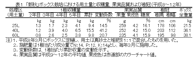 表1 「新秋」ボックス栽培における用土量と収穫量、果実品質および樹冠(平成8〜12年)
