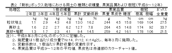 表2 「新秋」ボックス栽培における用土の種類と収穫量、果実品質および樹冠(平成8〜12年)