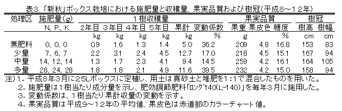 表3 「新秋」ボックス栽培における施肥量と収穫量、果実品質および樹冠(平成8〜12年)