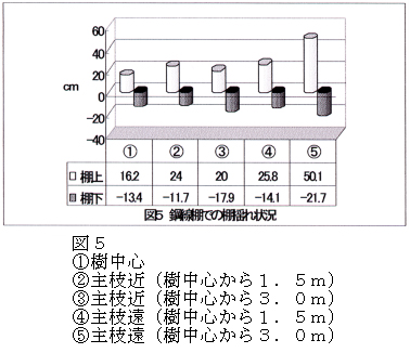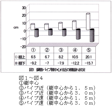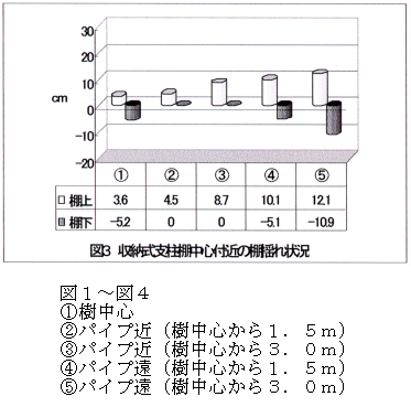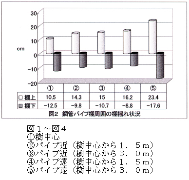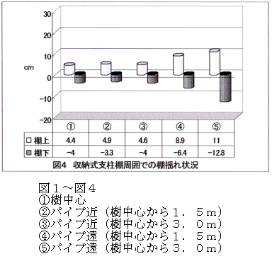 棚の最大の振幅は、鋼管パイプ棚では園の中心付近で35.8cm、園の外周部では41cmである(図1、図2)。