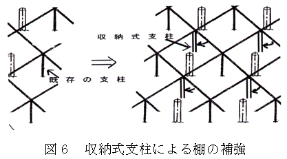 強風による棚振動を軽減するための棚の構造は、棚面に32mmの鋼管パイプを3m×3mで補強する。収納式支柱は既存の支柱間隔(5.6m×5.6m)の中心に取り付ける。支柱を固定するために約50kgのコンクリートブロック(一斗缶を利用)を土中に埋め込む(図6)。