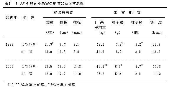 表1 ミツバチ放飼が果実の形質に及ぼす影響