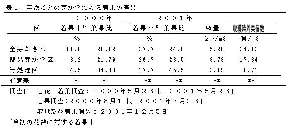 樹全体の20cm以上の枝を切除した区(以下全芽かき)、第2亜主枝以下を芽かきした区(以下簡易芽かき)ともに着果性が向上する。(表1)芽かき対象となる新梢は、着花が多い年に比べ、着花が少ない年は新梢の発生量が多く、芽かきの本数が多くなる。(表3)