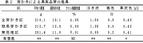芽かきにより、極大果が減少し、クエン酸はほぼ変わらず、糖度が高くなり、着色、果皮色も向上するが、浮き皮の発生は増える傾向にある。(表2)
