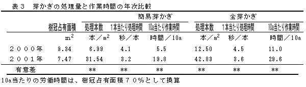 - 着花が多い年に比べ、着花の少ない年の芽かきは、作業効率は良くなるものの、10a当たりの作業時間は長くなる。10a当たりの労働時間は、着花が多い年で1〜2日程度、着花が少ない年で3〜5日程度となる。(表3)