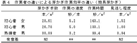 表4 作業者の違いによる芽かぎ作業効率の違い(簡易芽かぎ)