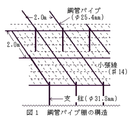 鋼管パイプ棚の構造は、支柱間隔が狭く、棚の鋼管パイプの直径が大きいほど強度が強く、強風時の棚振動の軽減に有効である(表1、表2)。