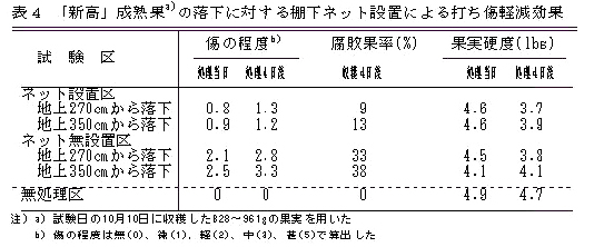 棚下へのネット設置は、落下によりネット上で果実同士の接触はあるものの、打ち傷の発生防止または軽減には有効である(表4)。
