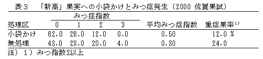表3 「新高」果実への小袋かけとみつ症発生(2000佐賀果試)