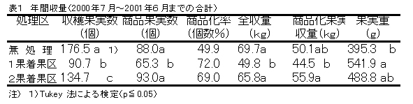 商品化率は、摘果により無処理に比べて高まる。また、収量は、無処理に比べ2果着果区では差はないが、1果着果区では減少した(表1)。