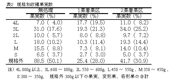 規格別収穫果実数は、2果着果区で商品価値の高いL〜3Lが多くなり、無処理では規格外果実が多くなった。また、1果着果区では3L〜4Lが多くなった(表2)。