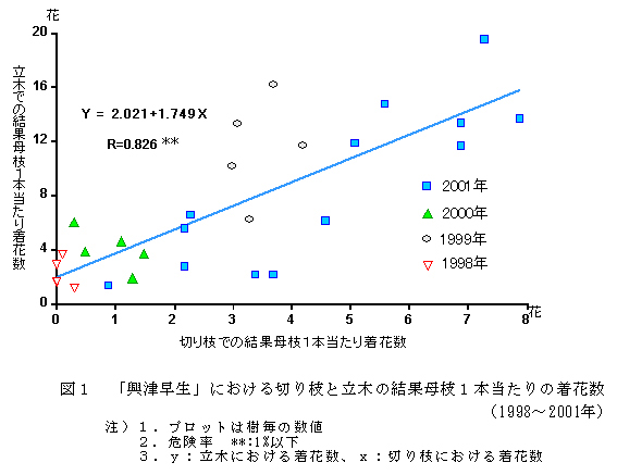 結果母枝1本当たりの着花数は、切り枝の着花数が多い場合には立木の着花数も多く、両者に正の高い相関が認められる(表1、図1)。