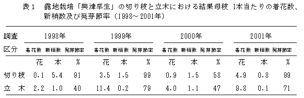 表1 露地栽培「興津早生」の切り枝と立木における結果母枝1本当たりの着花数、新梢数及び発芽節率(1998〜2001年)