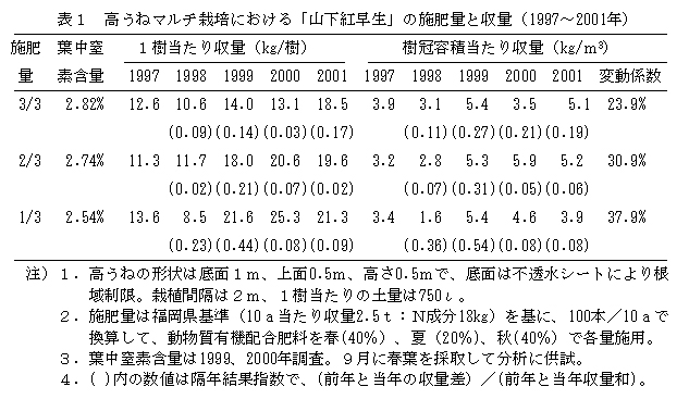 表1 高うねマルチ栽培における「山下紅早生」の施肥量と収量(1997〜2001年)