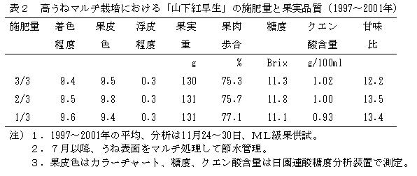表2 高うねマルチ栽培における「山下紅早生」の施肥量と果実品質(1997〜2001年)