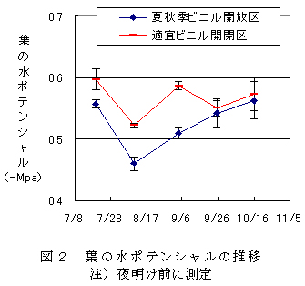処理期間中の葉の水ポテンシャルは、適宜ビニルを開閉することで安定して低く推移する(図2)。
