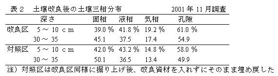 表2 土壌改良後の土壌三相分布2001年11月調査