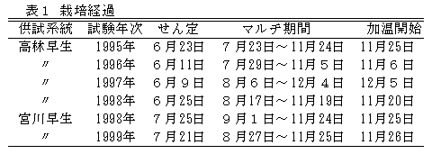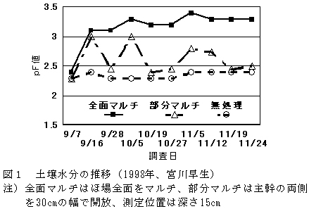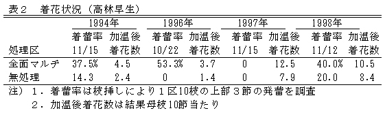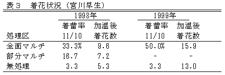 部分マルチでは土壌乾燥が安定せず着花促進効果も劣るため、マルチの方法は全面マルチがよい。(図1、表3)。