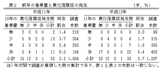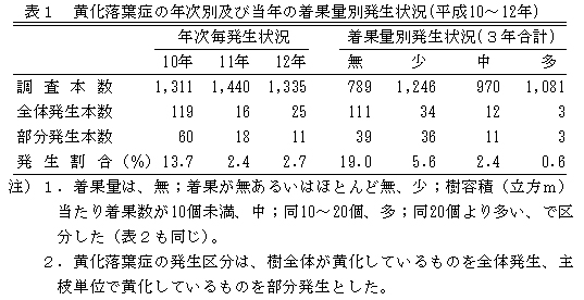 表1 黄化落葉症の年次別及び当年の着果量別発生状況(平成10〜12年)