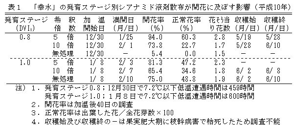 表1 「幸水」の発育ステージ別シアナミド液剤散布が開花に及ぼす影響(平成10年)