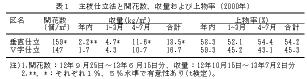 表1 主枝仕立法と開花数、収量および上物率(2000年)