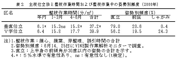 表2 主枝仕立法と整枝作業時間および整枝作業中の姿勢別頻度(2000年)