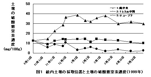 図1 畝内土壌の採取位置と土壌の硝酸態窒素濃度(1999年)