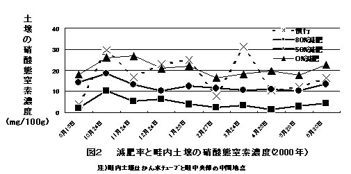 図2 減肥率と畦内土壌の硝酸態窒素濃度(2000年)