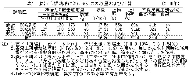 促成ナス「筑陽」は、全窒素濃度が0.13%、栽培期間中の土壌からの窒素供給量が20mg/100gで地力として中程度の砂壌土の圃場では、養液土耕栽培により慣行栽培の施肥量(窒素70kg/10a)を50%程度削減できる。その場合の1日当たりの施肥量は、10月〜2月の窒素施用量が130mg/株、3、4月が190mg/株、5、6月が250mg/株で、時期別収量に応じて調整する(表1)。