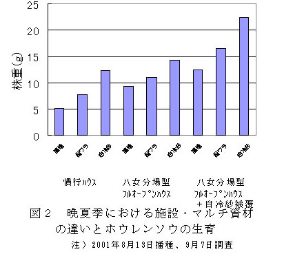 図2 晩夏季における施設・マルチ資材の違いとホウレンソウの生育