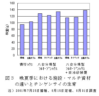 図3 晩夏季における施設・マルチ資材の違いとチンゲンサイの生育