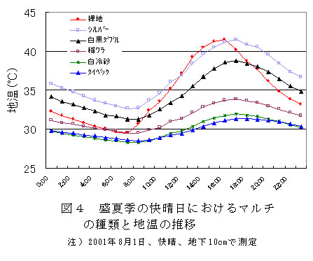 図4 盛夏季の快晴日におけるマルチの種類と地温の推移