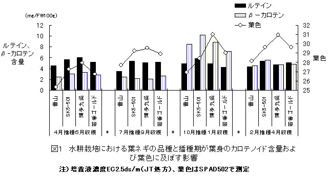 湛液式水耕栽培では、「雷山」、「SK5-501」、「博多九条」、「若香ゴールド」の葉身中の播種時期別β-カロテン含量は、10月に播種し1月に収穫する作型が7〜10mg/100gと最も多く、4月〜7月に播種し6月〜9月に収穫する作型の約2倍から5倍である。葉身中のルテイン含量は、栽培時期による変動が小さい(図1)。