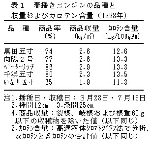 表2 春播きニンジンの在圃日数と収量およびカロテン含量(1999年)