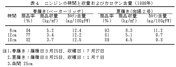 表4 ニンジンの株間と収量およびカロテン含量(1999年)