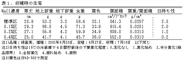 NaCl添加により葉色は濃く、葉は厚くなる(表1)。