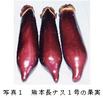 県内在来系統及び農研センター保存系統から、外観品質の安定した固定系統を選抜して1代交雑品種「熊本長ナス1号」を得た。