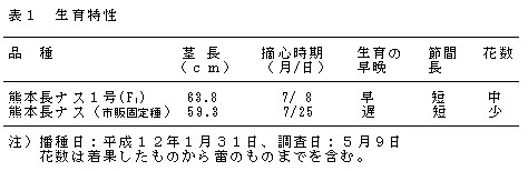 在来の「熊本長ナス」と同程度に草勢は強いが、やや生育が早く摘心時期も早くなる(表1)。