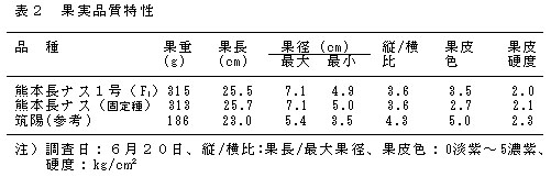 果形の揃いは在来種よりも良く、果径は太く重量感があり、果実の先端はやや尖る。果皮色は同様の赤紫色である。また、果皮の硬さは在来種と同程度に弾力性があり、「筑陽」に比べ柔らかい(表2、写真1)。