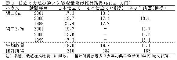 表3 仕立て方法の違いと総収量及び推計所得(t/10a、万円)