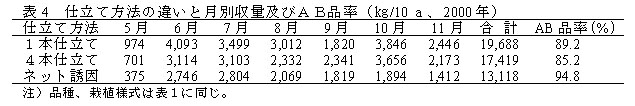 表4 仕立て方法の違いと月別収量及びAB品率(s/10a、2000年)