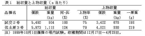 「佐土原3号」は雌花の着生、着果がよく、また上物率も高いことから、総収量、上物収量ともに「試交2号」より多い(表1)。