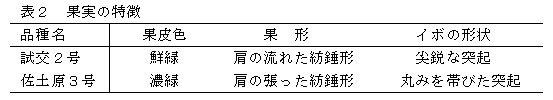 果色は濃緑色を示す。果形は「試交2号」が肩の流れる紡錘形であるのに対し、「佐土原3号」は肩が張った紡錘形である。また「佐土原3号」の果皮のこぶ状突起は丸みを帯びており(図1、表2)、輸送性に優れる。