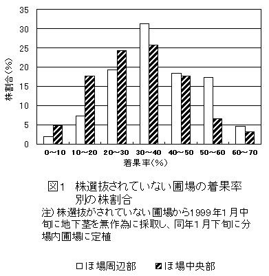 ホオズキの着果率は同一ほ場内でも株によって異なり、また産地によっても大幅にばらつく。このため、着果率の高い系統を複数年選抜していくことにより、着果率の向上を図ることができる。