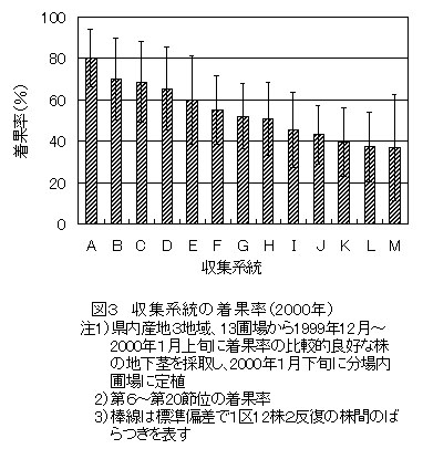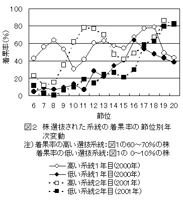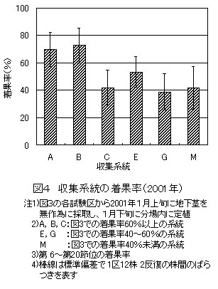県内の産地3地域、13圃場から収集した系統の着果率は、80〜40%のばらつきが見られる(図3)。また、系統によっては、着果率の年次変動が見られる(図4)。このため、着果率が高位安定化するまで優良系統の収集と選抜を継続する。