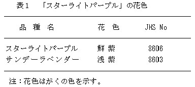 1997年度に県内栽培農家の実生系品種「ソピア」から優良と思われる個体を選抜・収集し、1999・2000年度に市販品種と比較した結果、「スターライトパープル」を選抜した。主要な特性は以下のとおりである。