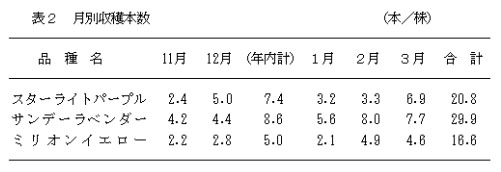 年内に対照の多収品種「サンデーラベンダー」とほぼ同等の7本以上収穫でき、促成栽培に適した品種である。また、3月までの1株当たりの収穫本数は20.8本と、「サンデーラベンダー」には及ばないものの「ミリオンイエロー」を上回った。(表2)