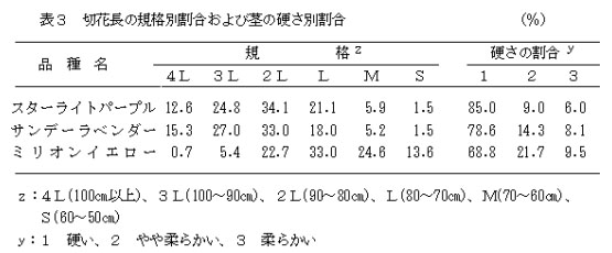 花色は鮮紫色(8606)であり、切花長は80〜100cmで、茎は硬く、切花品質が優れている。(表1、表3)