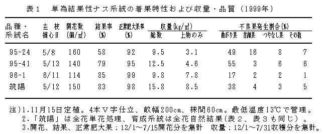 表1 単為結果性ナス系統の着果特性および収量・品質(1999年)