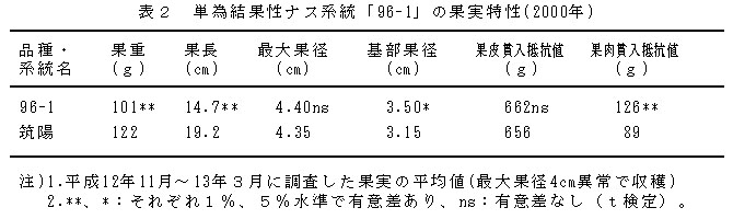 表2 単為結果性ナス系統「96-1」の果実特性(2000年)